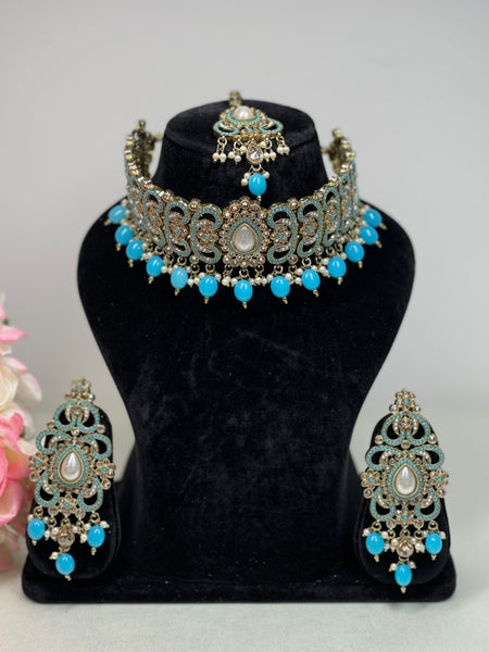 Stunning grey choker set with matching earings and matching maang tikka to pair with your indian wear. This can be worn with Lehngas, Suits or Sarees. Perfect for weddings and engagements
