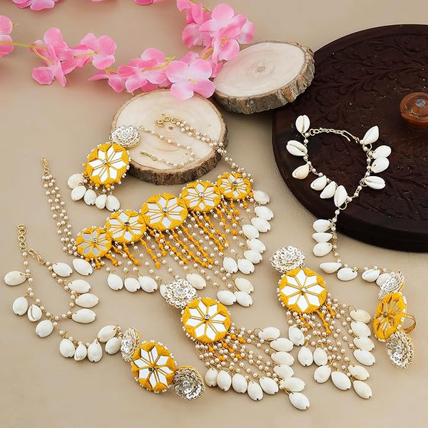 Traditional Mirror work necklace with matching earings and maang tikka. This piece of jewellery will go with all your Indian outfits and get those compliments flowing.