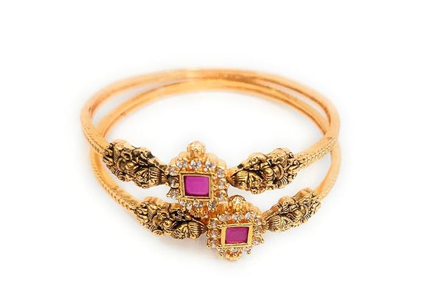 Gorgeous antique gold plated kada pair with sparkling mirror work and Royal Red Ruby Stone work. Wear this with almost anything Indian for a rich and elegant look.