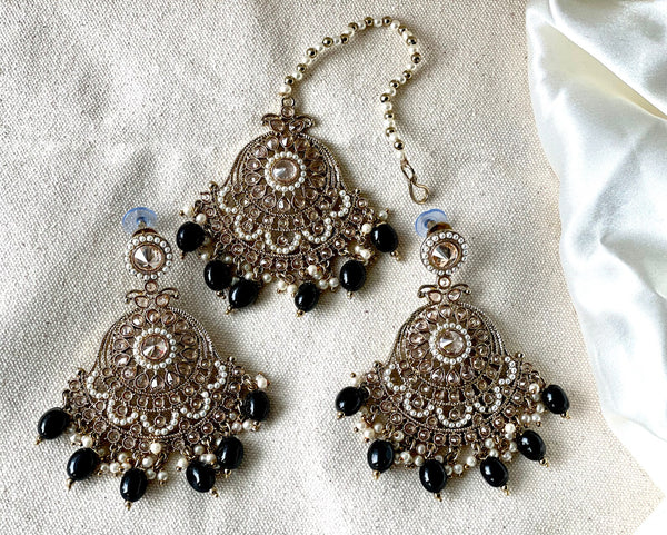 Beautiful Black Jhumka Style Earrings inspired by the rich culture of Indo/Pak to complement an outfit for a special evening. This piece comes with a matching maang tikka. Comes in variety of colors to choose from. Accessorise your outfit and complete that evening look. This piece is surely made to get those heads turning.