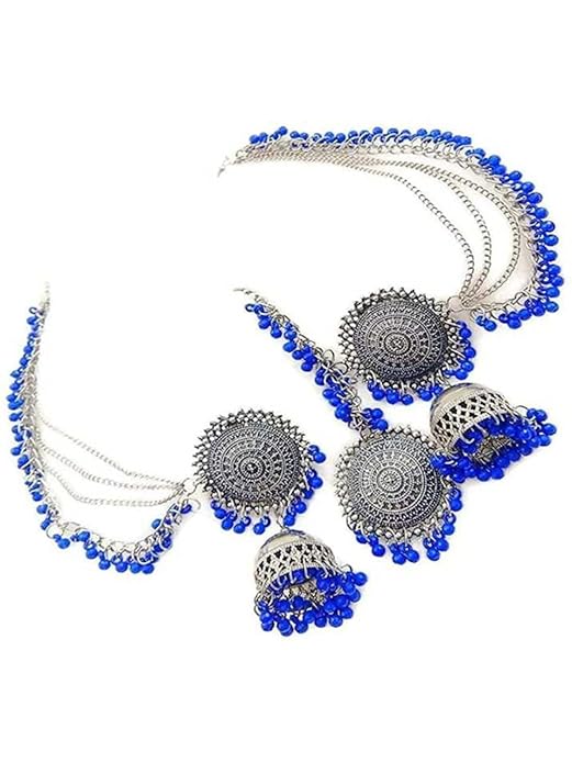 Beautiful Blue Jhumka Style Earrings inspired by the rich culture of Indo/Pak to complement an outfit for a special evening. This piece comes with a matching maang tikka. Comes in variety of colors to choose from. Accessorise your outfit and complete that evening look. This piece is surely made to get those heads turning.